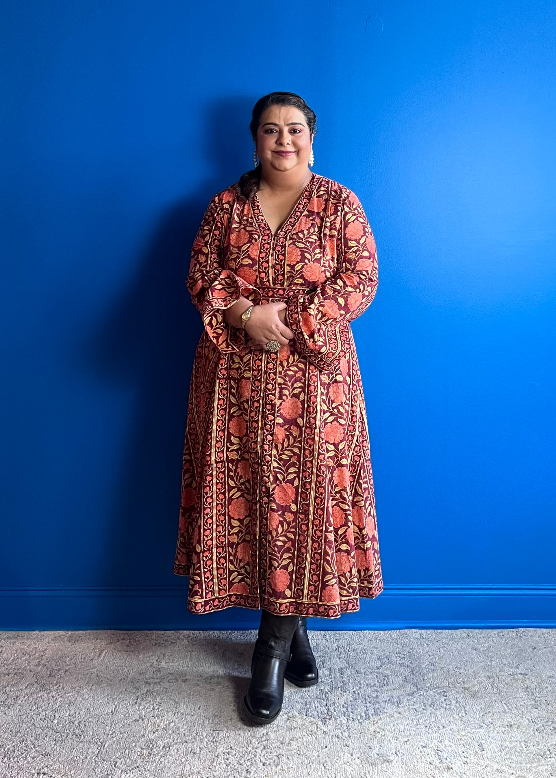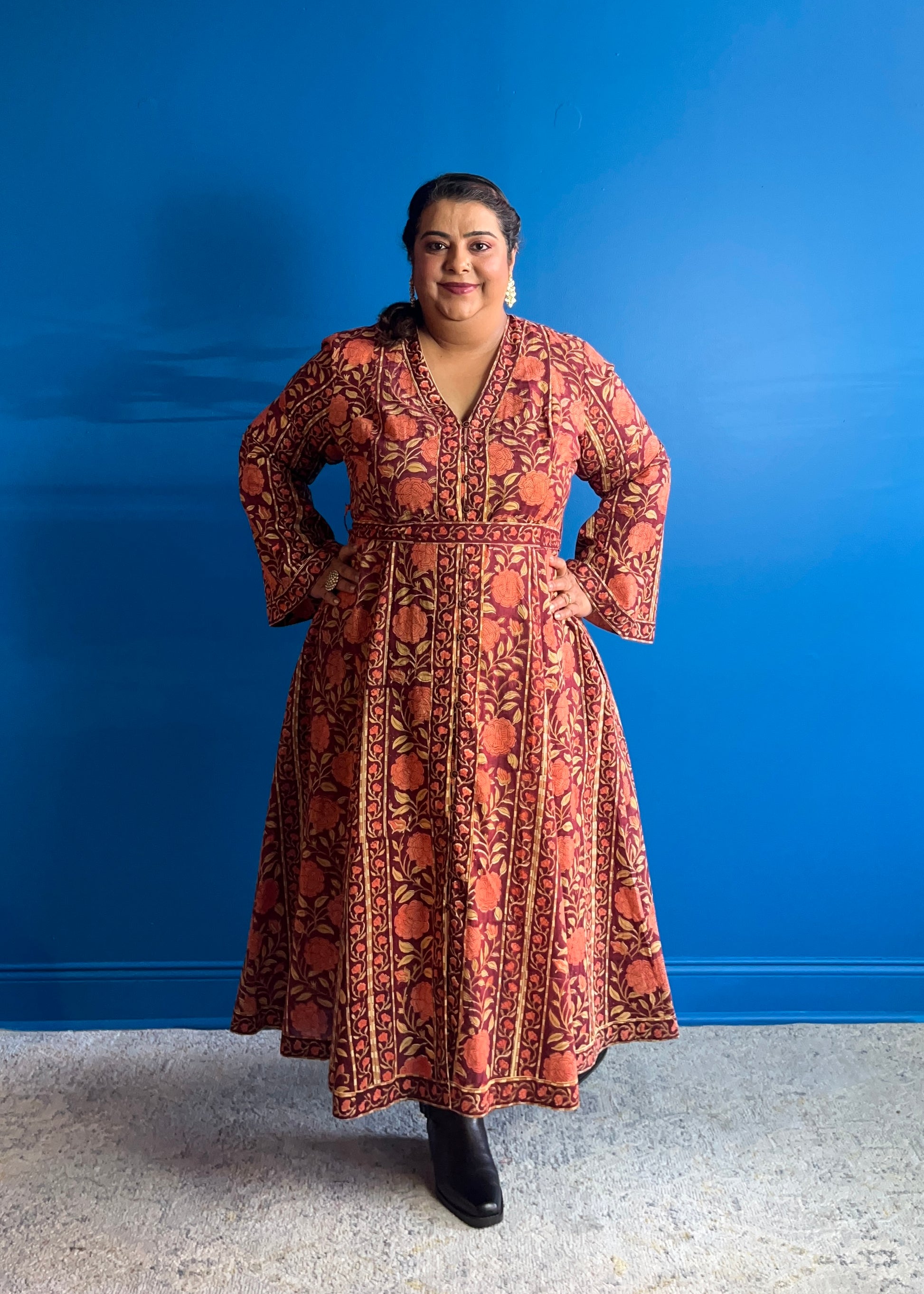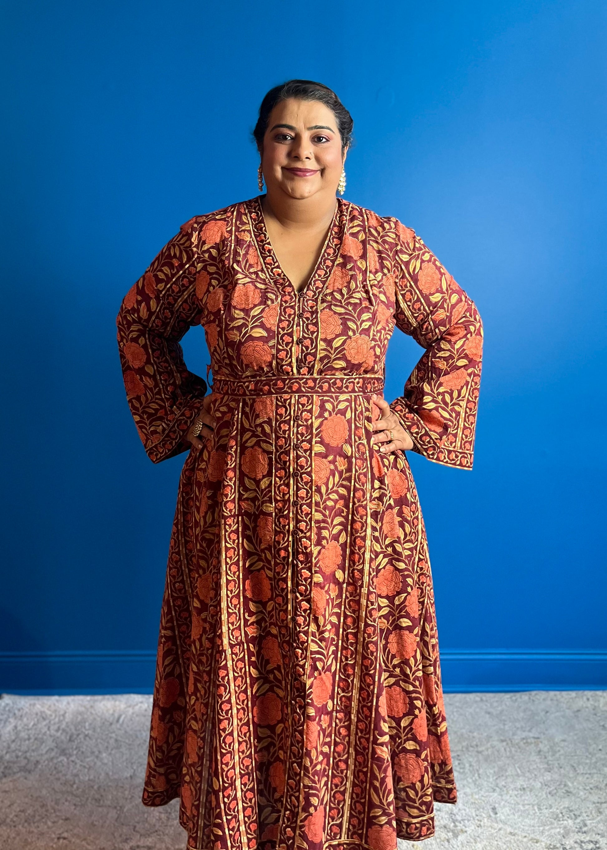 Fabric for this dress is handblocked printed by artisans. There may be slight differences/variations in products as shown in the photographs in terms of colors, prints, textures as it is a part of the process involved in the making of handcrafted products.
