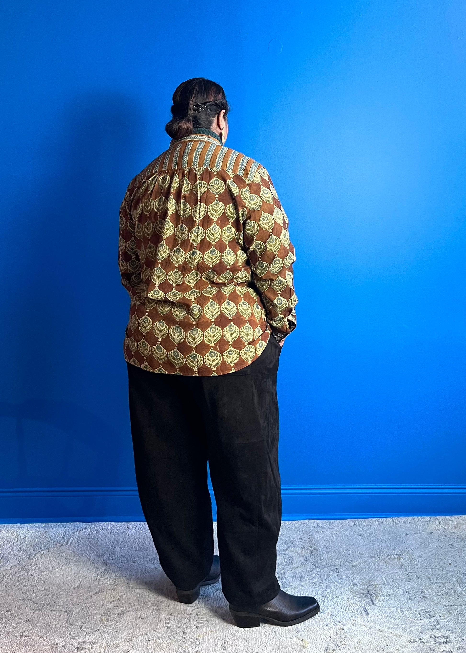 This brown blouse features a band collar, button front, and hand-printed contrast yoke, cuff, and placket. Made from cotton, it can be paired with jeans or pants for a stylish look. The unique design and high-quality material make it a versatile and fashionable addition to any wardrobe.