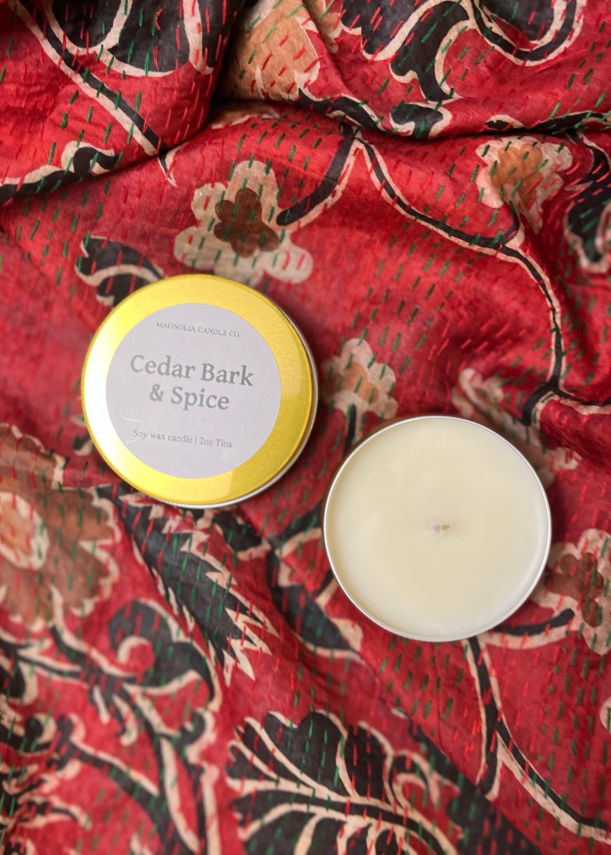 Create a cozy holiday atmosphere with our Christmas Candle Tins. Made with 100% natural and organic soy wax, these 2oz celebration candles come in festive scents of Cedar Bark and Spice. Perfect as stocking stuffers or mini gifts.