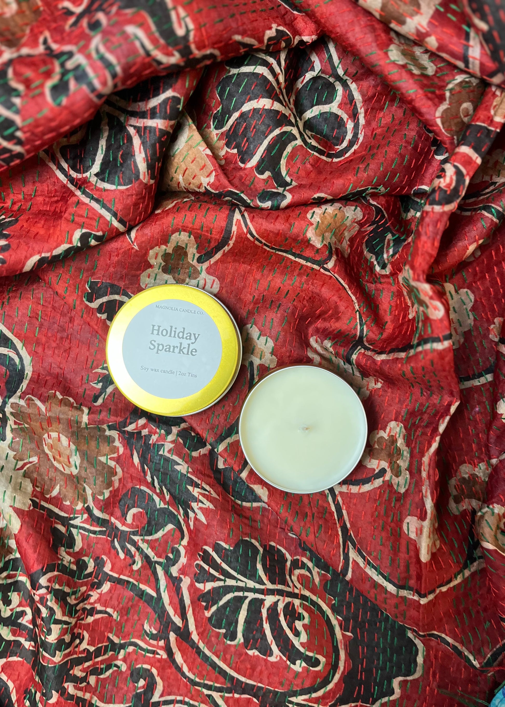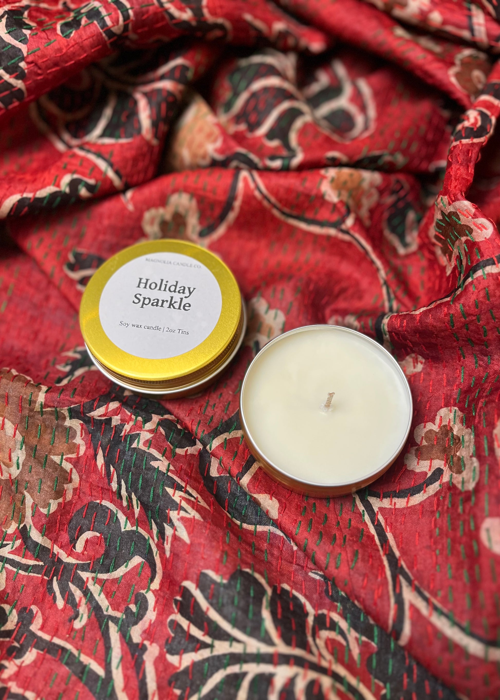 Get ready to sparkle this holiday season with our Stocking Stuffers Candle Tin! Made with 100% natural soy wax and scented with our festive Holiday Sparkle fragrance, these 2oz candles are the perfect small gift to spread holiday cheer. Stock up on these perfect stocking stuffers today!