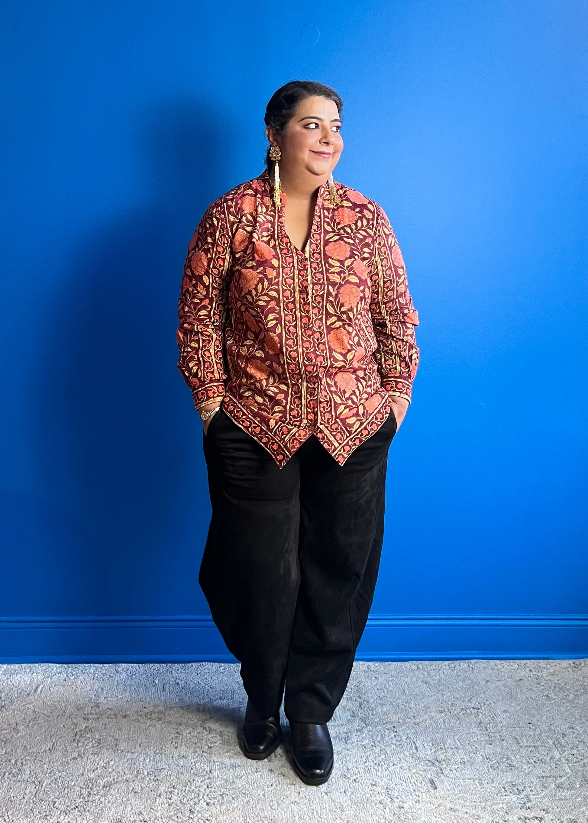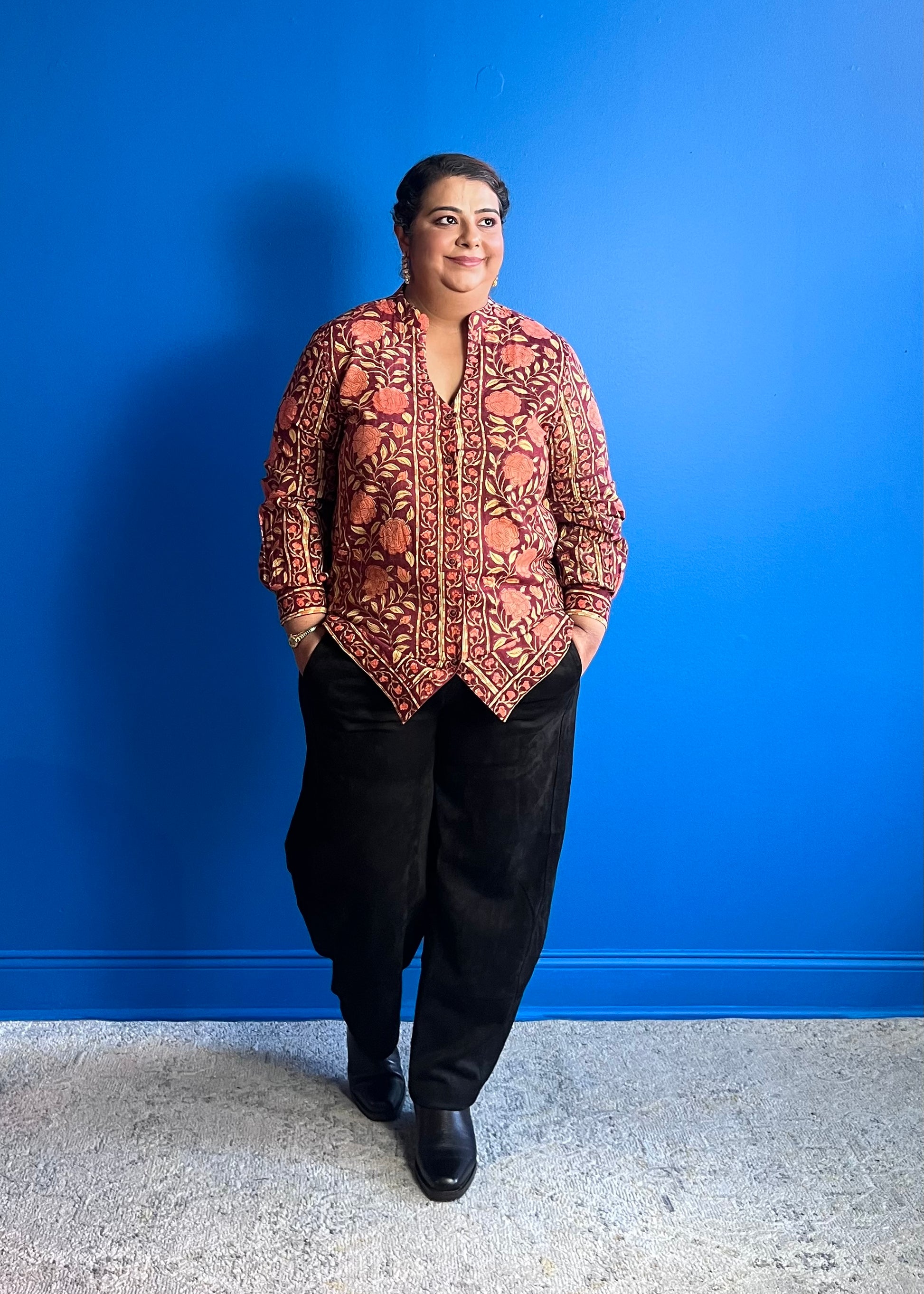 This maroon long blouse is perfect for a dressy occasion. Made with hand printed cotton fabric, it features a button front and wooden buttons. The longer length provides a good fit and adds a touch of elegance. Elevate your style with this unique piece.
