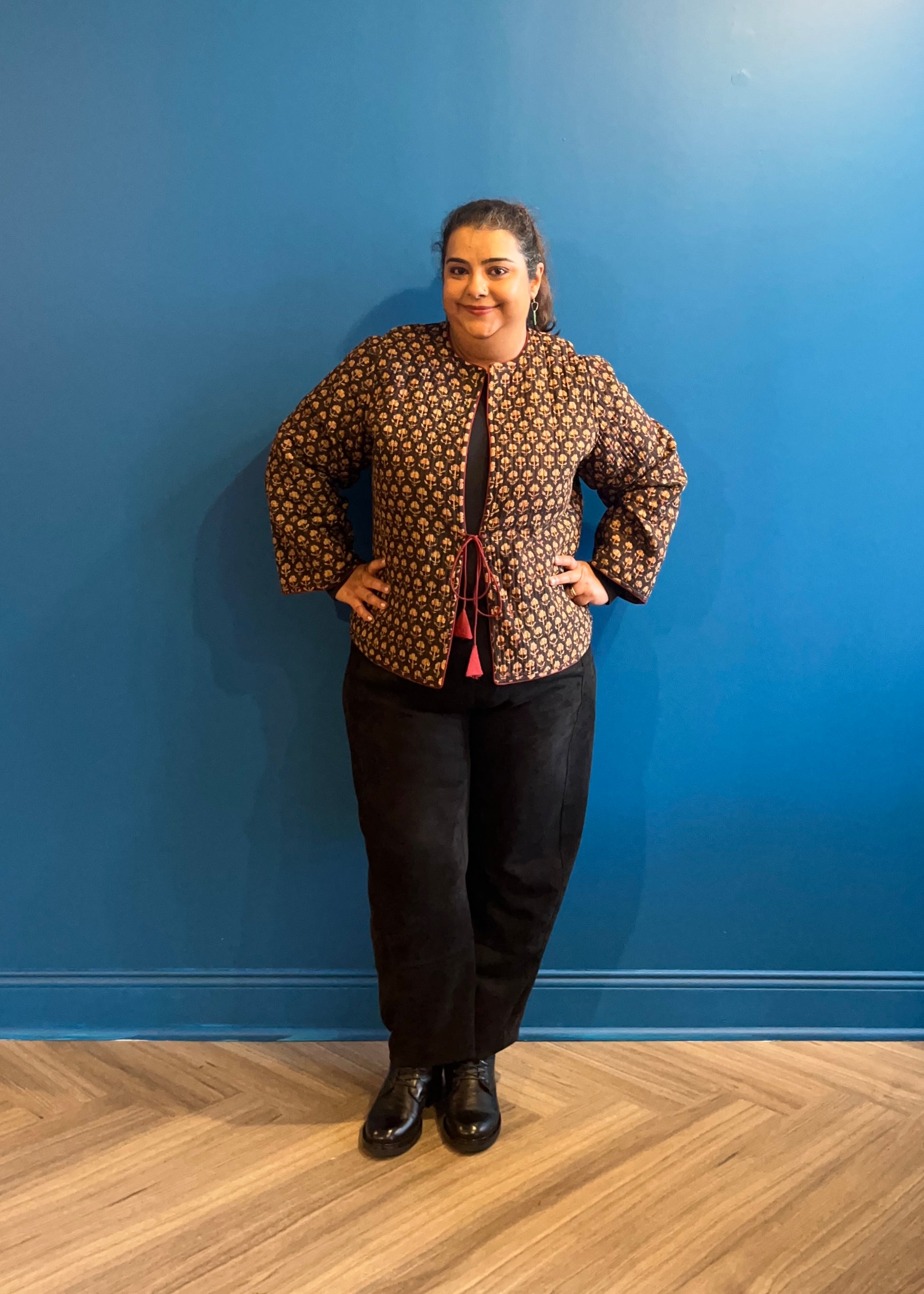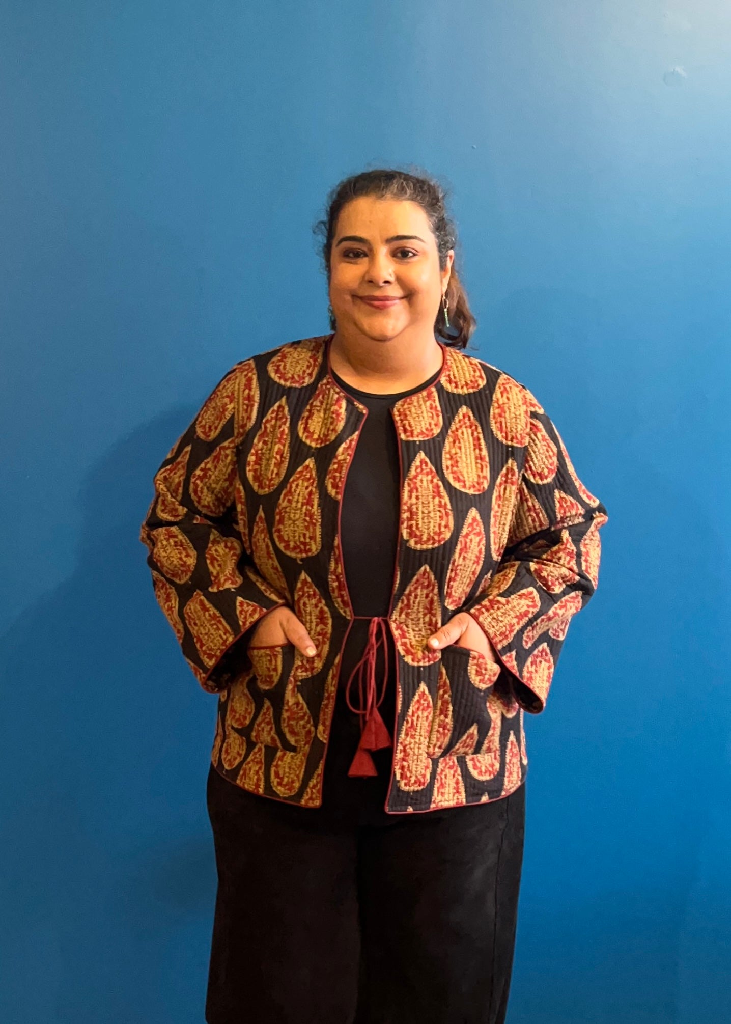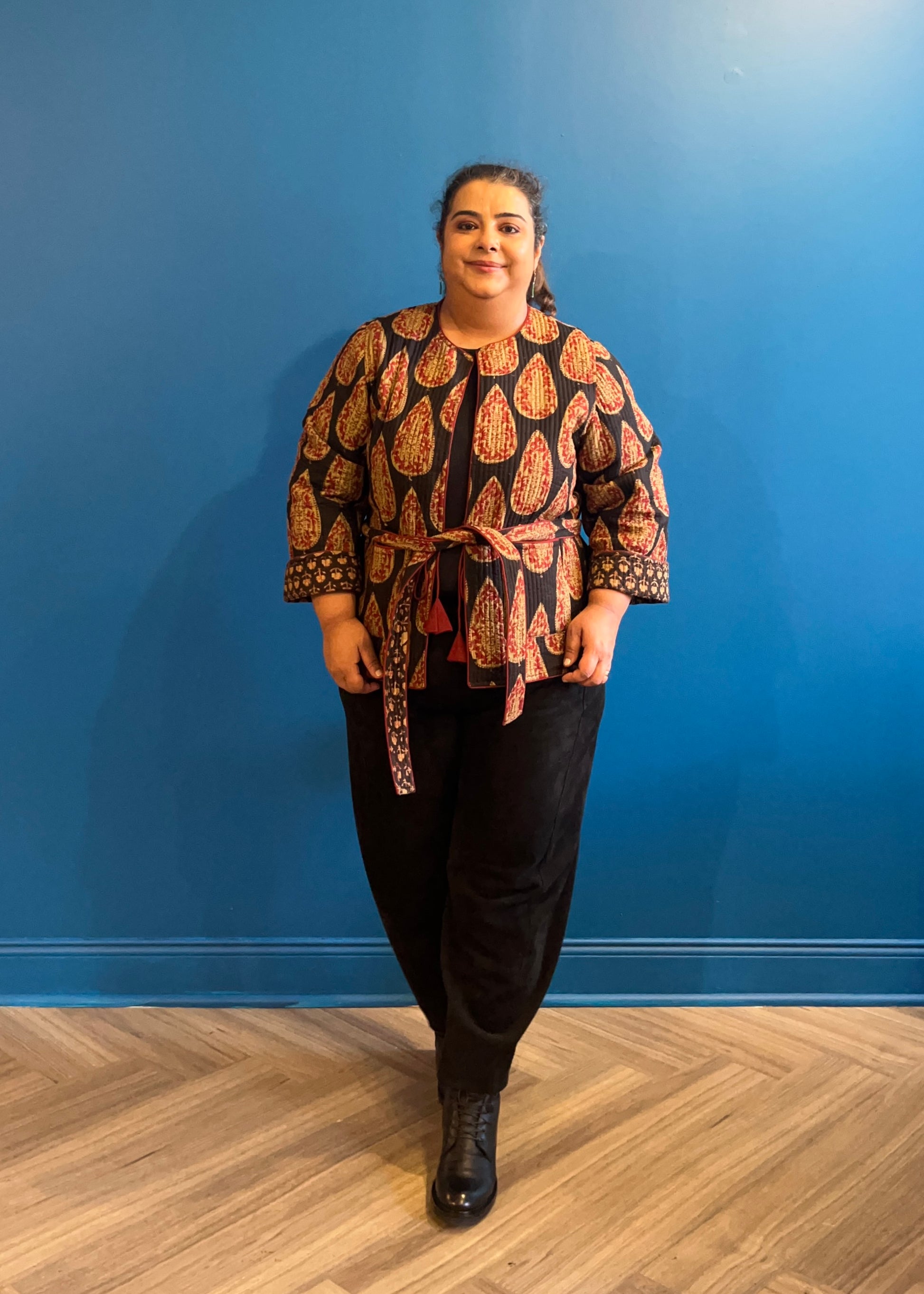 Fabric for this Jacket is handblocked printed by artisans. There may be slight differences/variations in products as shown in the photographs in terms of colors, prints, textures as it is a part of the process involved in the making of handcrafted products.