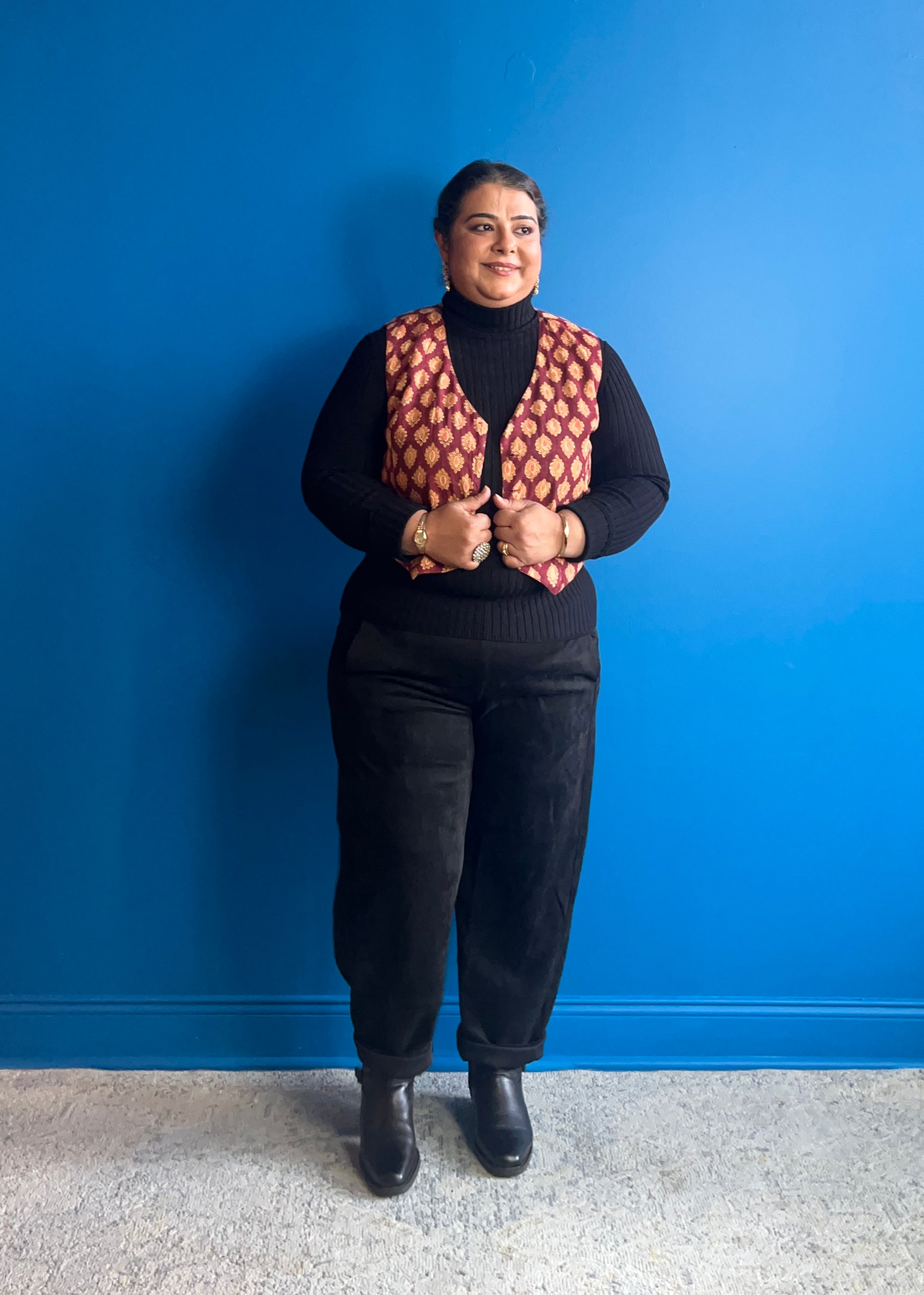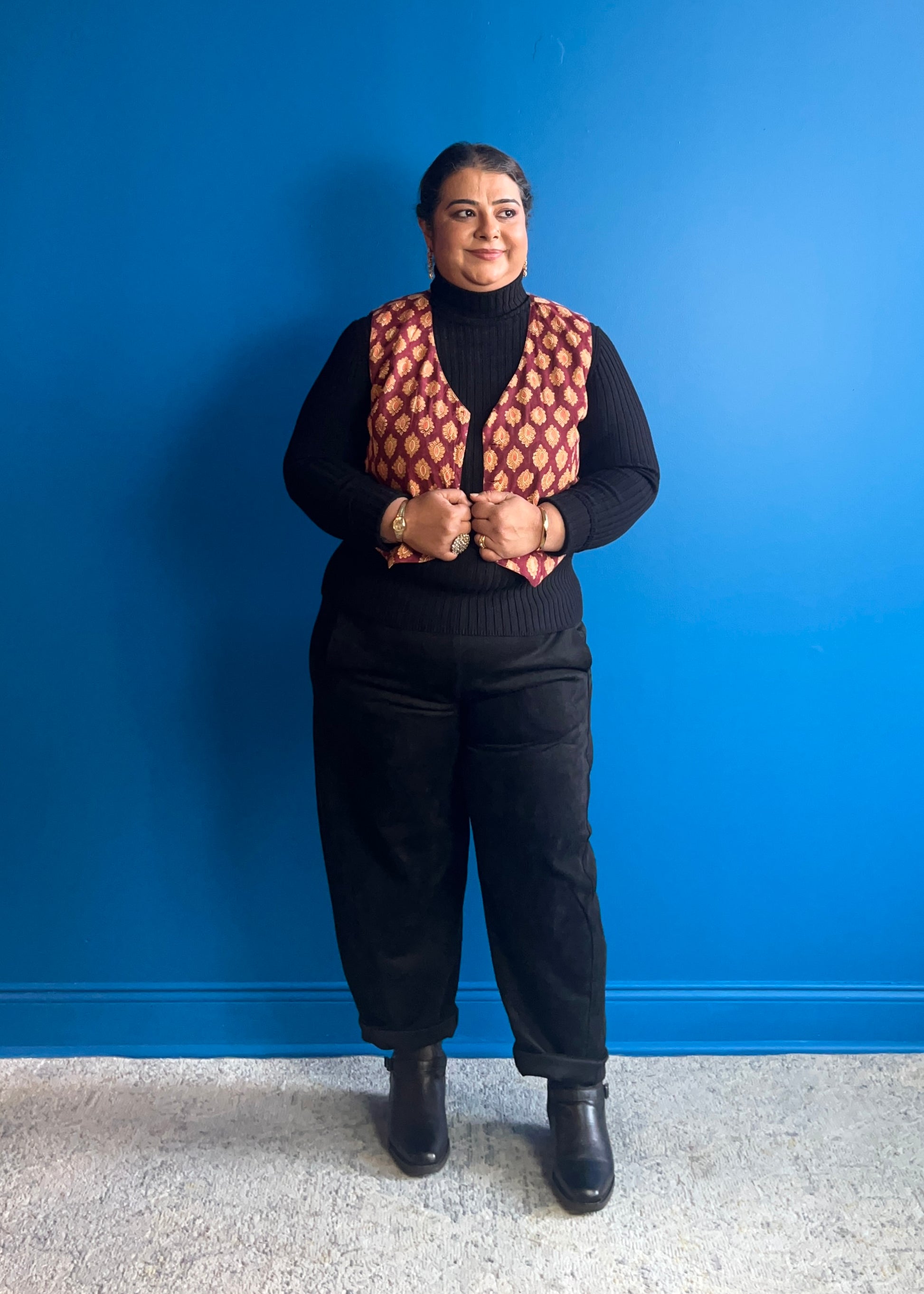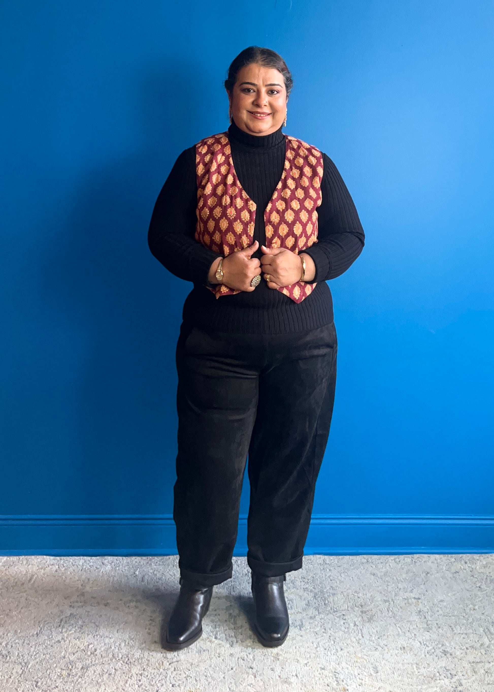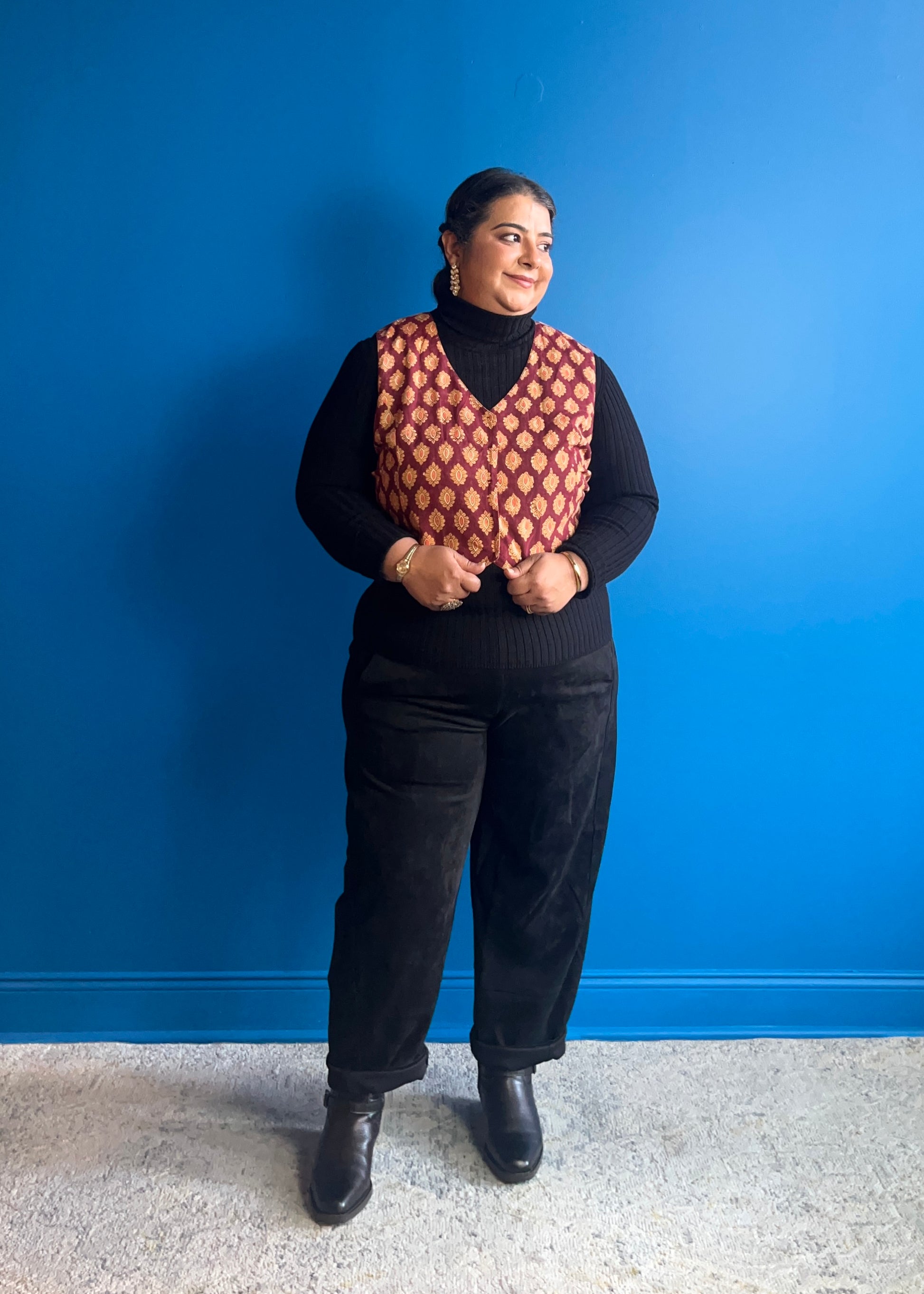Looking for a versatile and stylish layering piece? Look no further than our reversible printed vest! Made with light weight hand printed cotton, this vest is perfect for adding a pop of color and pattern to any outfit. Plus, it's perfect for styling - wear it as a fun statement piece or a subtle layer. One vest, endless possibilities!