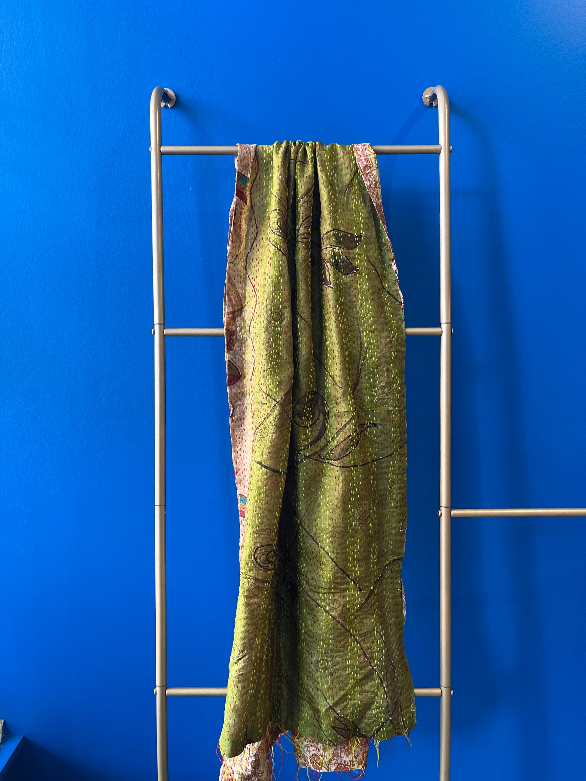 Wrap yourself in a story with this Silk/Silk Blend Scarf, crafted from recycled vintage silk saris using the colorful, hand-stitched kantha technique. Each scarf is a one-of-a-kind treasure with reversible designs, perfect for switching up your style. Soft and smooth to the touch, its tiny vintage quirks—a loose thread here, a subtle worn spot there—add personality and charm. Ready to play dress-up with your wardrobe? This scarf is your new best friend!