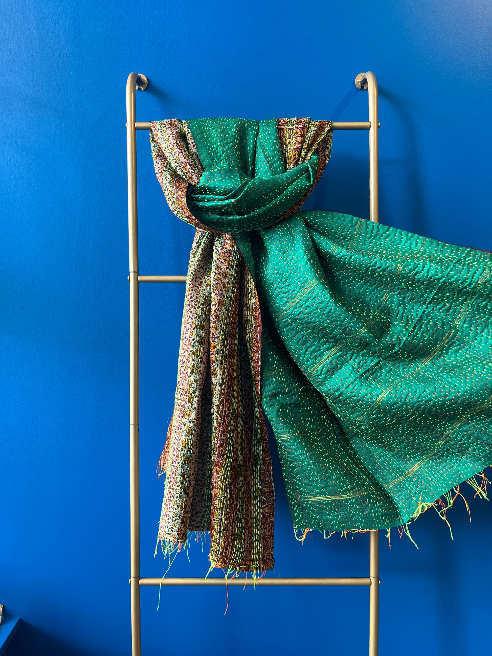 Wrap yourself in a story with this Silk/Silk Blend Scarf, crafted from recycled vintage silk saris using the colorful, hand-stitched kantha technique. Each scarf is a one-of-a-kind treasure with reversible designs, perfect for switching up your style. Soft and smooth to the touch, its tiny vintage quirks—a loose thread here, a subtle worn spot there—add personality and charm. Ready to play dress-up with your wardrobe? This scarf is your new best friend!