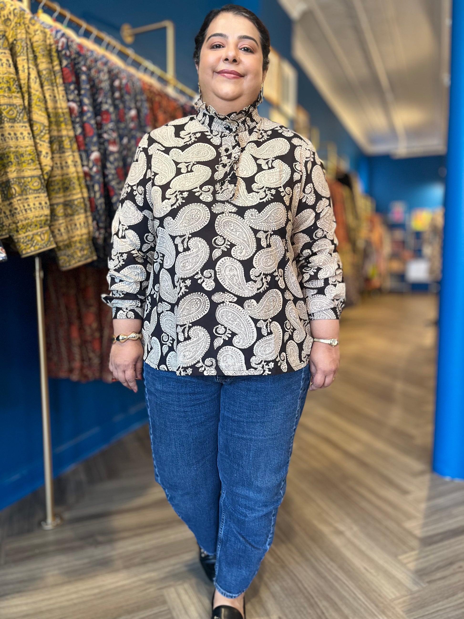 This black top features a unique frill design on the placket, collar, and sleeves, giving it a cute and stylish look. Made with 100% cotton, it is easy to layer with a blazer and pairs well with black, grey, and beige bottoms. The button placket and true-to-size fit make it a versatile and comfortable choice.