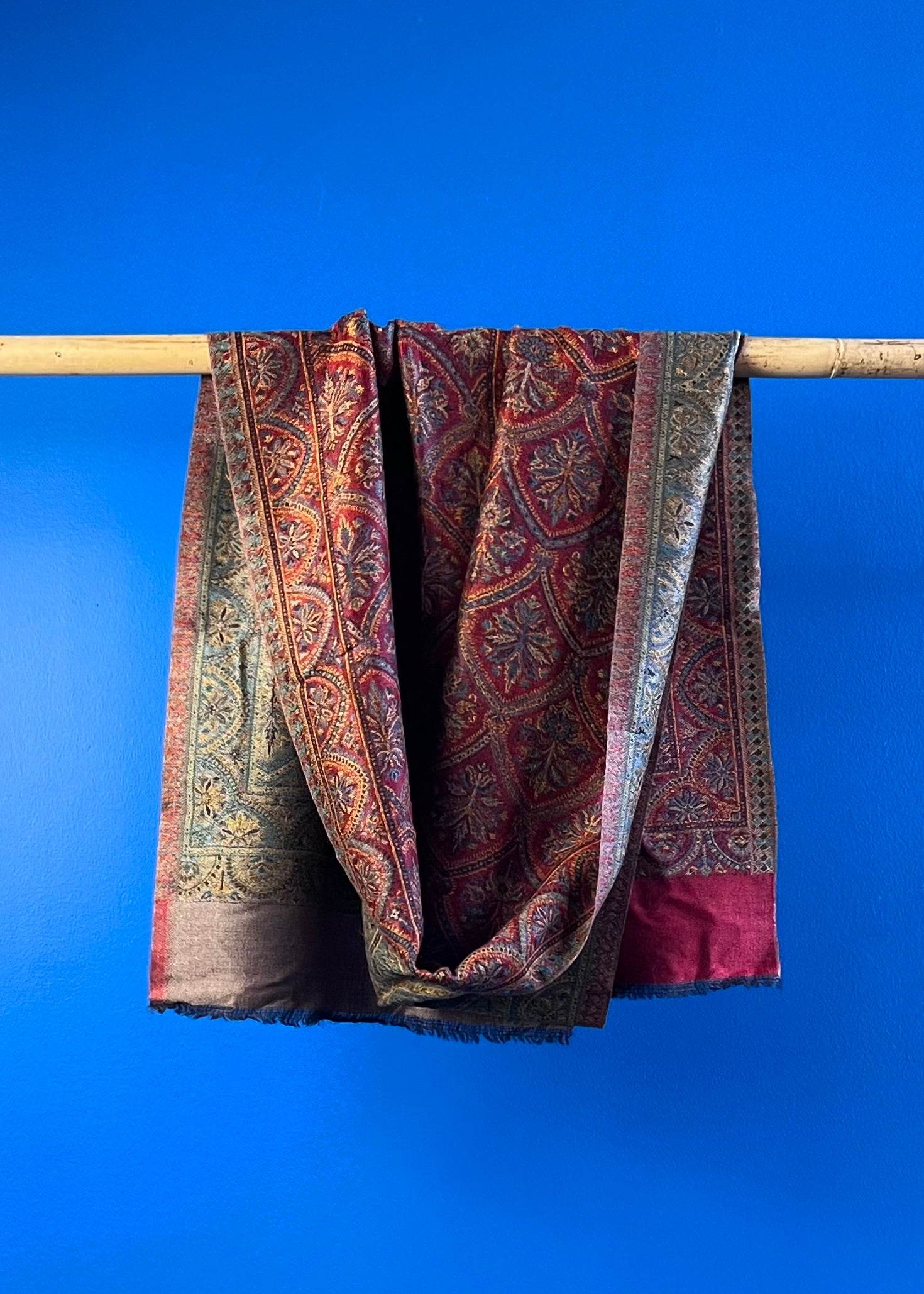 Wrap yourself in luxury with this stunning narrow neck scarf, where premium Wool and Tencel blend together for the ultimate cozy companion. Featuring an intricate Jamavar pattern in rich red and black tones, this piece is as soft as it is sophisticated. Perfect for adding a touch of elegance to any outfit while keeping you warm and wonderfully snug. A timeless accessory that feels as good as it looks!