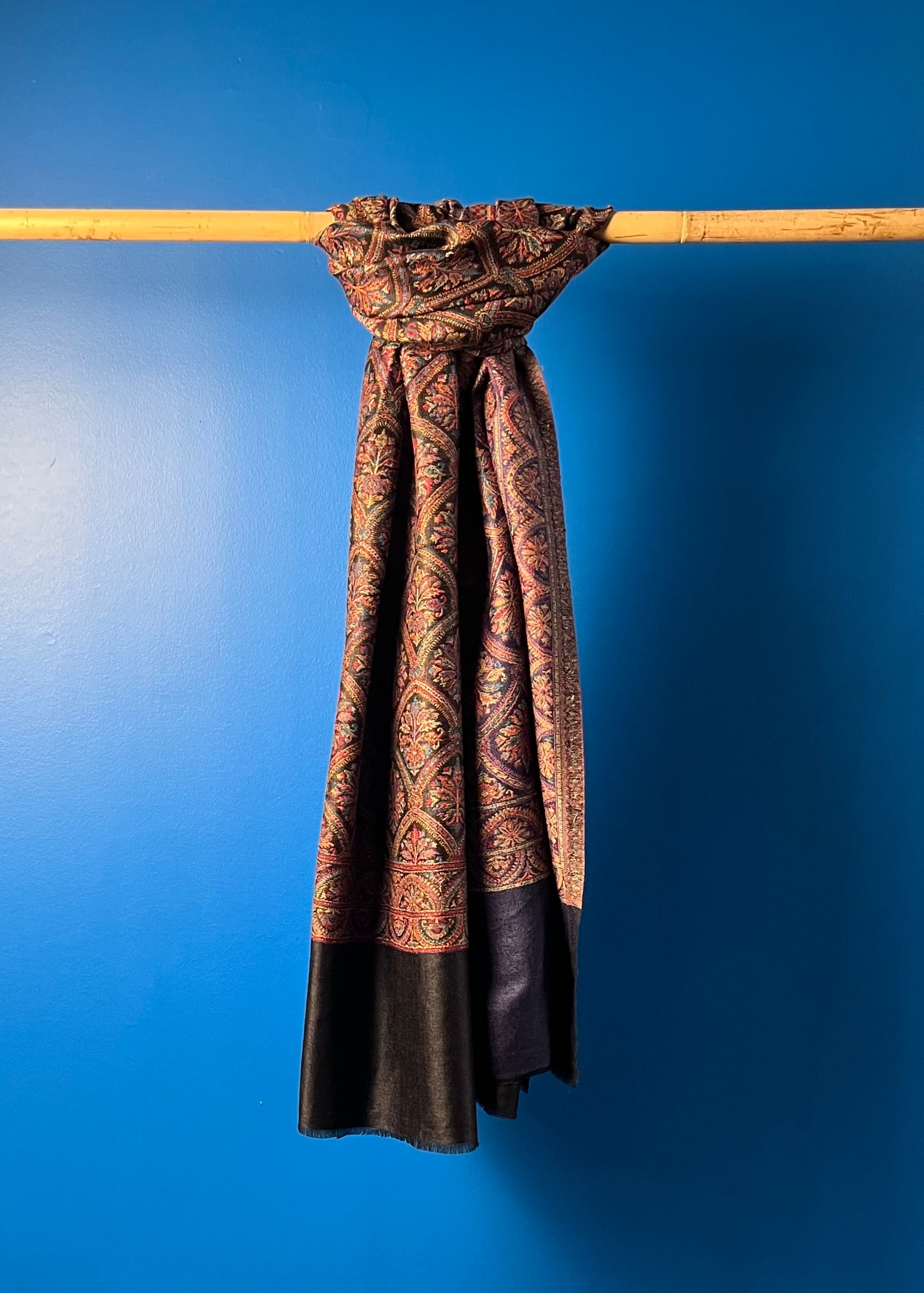 Discover the magic of reversibility with this exquisite jamavar weave scarf that's basically two scarves in one! Luxuriously crafted from wool and Tencel, it wraps you in softness and warmth while showcasing jewel-toned multicolored threads on both sides—each with its own captivating hue. Flip it, twist it, drape it however you like; this beauty transforms any outfit into something utterly fabulous.